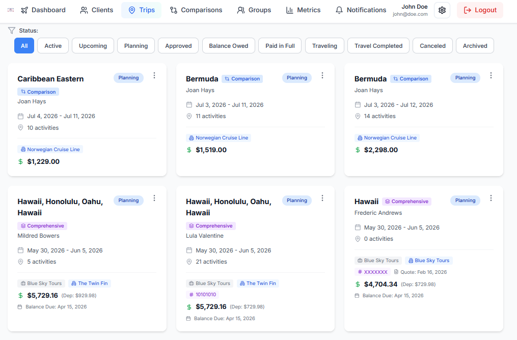 - Designed around travel workflows and the client lifecycle